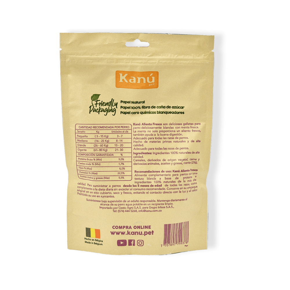 Las Galletas Kanu Pet Aliento Fresco son un alimento complementario para perros. Poseen una textura blanda a base de proteína e ingredientes 100% naturales de alta calidad. Pueden ser suministradas a perros que superen los 5 meses de edad, sin importar su raza o tamaño. Funcionan como complemento a la dieta diaria sin exceder el consumo recomendado.